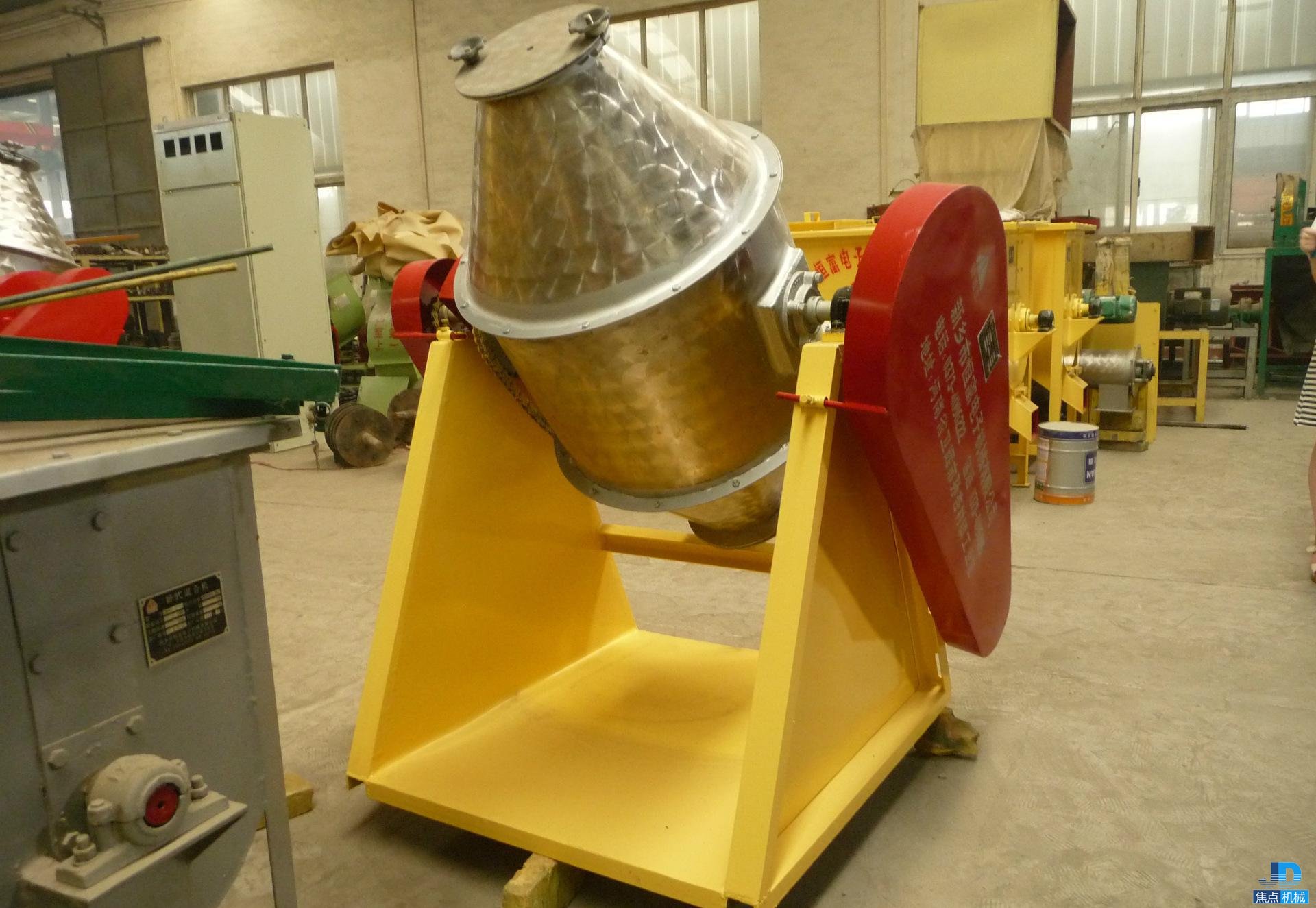 雙錐混合器的兩個圓錐形也是不對稱的,但圓柱空間是整體的,不管左右。當混合器旋轉時,在滾筒重力作用下的物料表現出上下翻滾的效果,上面的材料到底部的材料,下到底部的材料,整個操作的材料,整個混合物。如果在圓筒上加擋板,效果會更好,混合時間也會更短。