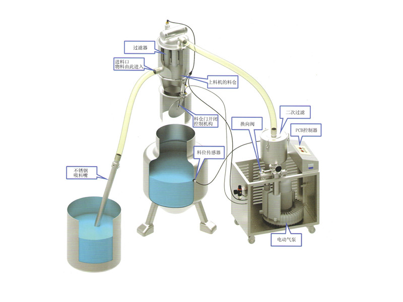 電動真空加料機由電動氣泵產生真空即負壓,這樣真空加料機將通過輸料管從儲料倉中將物料吸入上料機料倉內,再經過過濾器將氣物分離,上料時間由PCB控制器決定,吸料結束,氣動開閉機構將料倉門打開將物料放入相關的設備中,反吹裝置將反吹吸附在過濾器上的粉末,將粉末清除掉,然后再關閉料倉門,下一個循環開始。