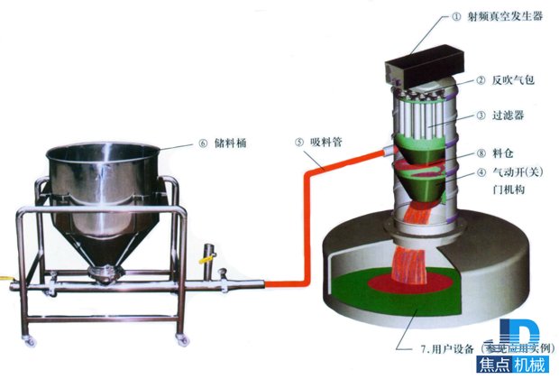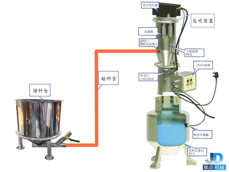 氣動真空加料機由壓縮空氣真空發生器產生真空即負壓,這樣真空加料機將通過輸料管從儲料倉中將物料吸入上料機料倉內,再經過過濾器將氣物分離,上料時間由PCB控制器決定,吸料結束,氣動開閉機構將料倉門打開將物料放入相關的設備中,反吹裝置將反吹吸附在過濾器上的粉末,將粉末清除掉,然后再關閉料倉門,下一個循環開始。如下圖:
